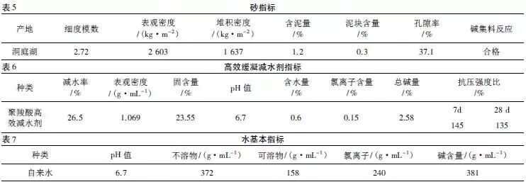 2)矿渣粉,又称粒化高炉矿渣粉,符合国家标准《用于水泥和混凝土中的粒化高炉矿渣粉》(GB/T18736—2008)中,正式将矿渣微粉命名为“矿物外加剂”,分S105级、S95级、S75级或Ⅰ级、Ⅱ级、Ⅲ级。矿粉等量取代部分水泥掺入混凝土中,可改善混凝土的工作性,凝结时间、提高强度、改善混凝土的耐久性。目前矿粉的应用,改变了以粉煤灰为主要掺合料的局面,同时克服了仅掺粉煤灰时取代水泥量有限的弱点,可进一步降低水泥用量,减少水化热、增加强度、改善混凝土工作性能、改善混凝土耐久性,而且大大降低生产成本,节约能源、保护环境,为混凝土的可持续发展提供基础(其他原材料参见表2~7)。