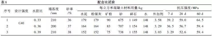 本试验采用粉煤灰掺量为胶凝材料的40%,矿粉掺量为胶凝材料的20%。考虑到复掺对强度的影响,经前期试验选用基准水胶比0.36。为满足混凝土和易性,选定水泥混凝土砂率确定为38%。根据基准水胶比上下浮动,进行以下配合比试验,如表8。
